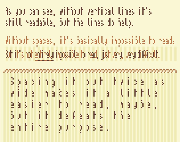 Picket Right isn't easy to read, sure, but I'm still amazed that it's readable at all. The idea is to trick your vision into thinking you're only seeing half of each letter, so your brain can fill in the rest of the details.